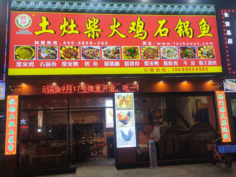 店面介绍:我们是一家专业推广特色土灶柴火鸡、柴火鱼、柴火羊肉、柴火狗肉的餐饮连锁机构。本店推出传统乡村土灶柴火鸡,柴火鱼,柴火羊肉,柴火狗肉农村大铁锅等,劈柴生火,独家秘方,口味独特,现场制作,秉承(绿色,营养,健康)的宗旨,菜肴原滋原味,清而不淡,香而不腻,其别具特色就餐模式,温馨舒适的就餐环境,是你商务宴请,亲友欢聚,品农家特色美食的最佳之选! 土锅土灶土风情,家香家味家感觉!土灶柴火鸡、柴火鱼选用正宗菜籽油、花生油、用木柴烧火现场烹制、原汁原味、绿色健康、吃的放心、吃出久违的农村风味寻找到儿时童真的记忆,妈妈的味道!店面文化主题从视觉(文化饰品)、听觉(音响语言)、味觉全方位展现乡村文化,让身在众多成年奔波的人有回家的亲切体验!