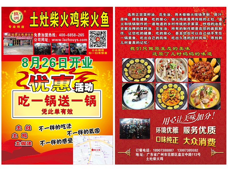 店面介绍:花都盘古中路店是一家专业推广特色土灶柴火鸡、柴火鱼、柴火羊肉、柴火狗肉的餐饮连锁机构。本店推出传统乡村土灶柴火鸡,柴火鱼,柴火羊肉,柴火狗肉农村大铁锅等,劈柴生火,独家秘方,口味独特,现场制作,秉承(绿色,营养,健康)的宗旨,菜肴原滋原味,清而不淡,香而不腻,其别具特色就餐模式,温馨舒适的就餐环境,是你商务宴请,亲友欢聚,品农家特色美食的最佳之选!