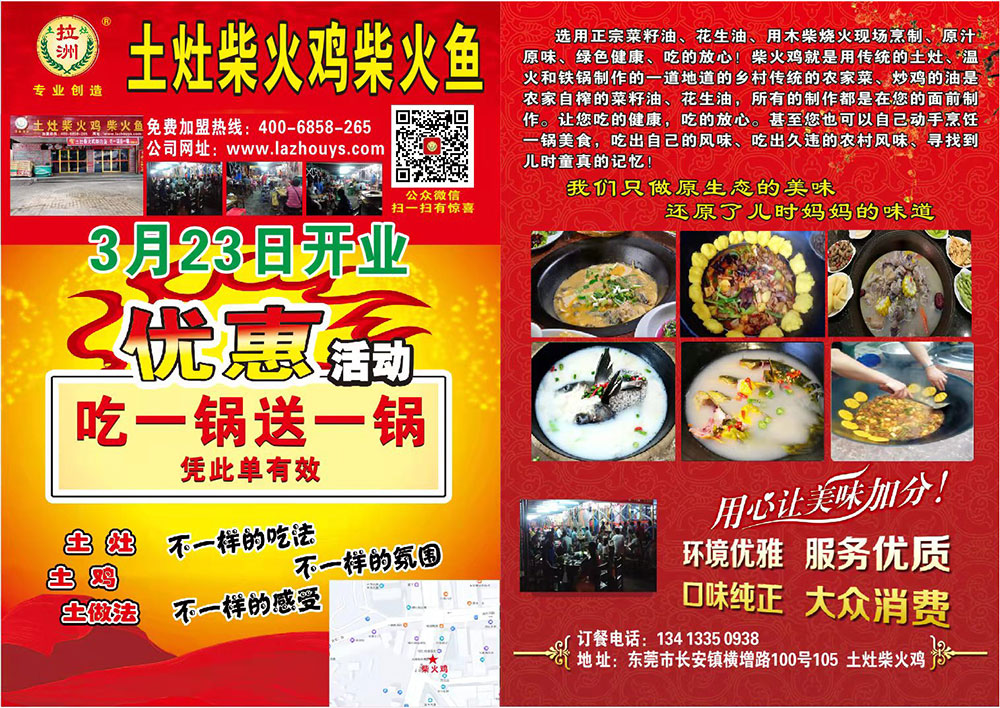 店面介绍:我们是一家专业推广特色土灶柴火鸡、柴火鱼、柴火羊肉、柴火狗肉的餐饮连锁机构。本店推出传统乡村土灶柴火鸡,柴火鱼,柴火羊肉,柴火狗肉农村大铁锅等,劈柴生火,独家秘方,口味独特,现场制作,秉承(绿色,营养,健康)的宗旨,菜肴原滋原味,清而不淡,香而不腻,其别具特色就餐模式,温馨舒适的就餐环境,是你商务宴请,亲友欢聚,品农家特色美食的最佳之选!