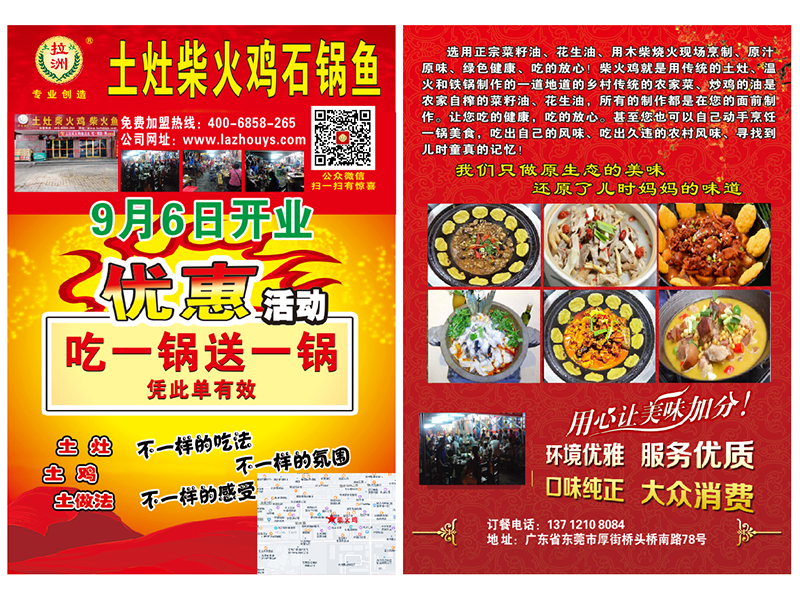 店面介绍:东莞厚街桥头店是一家专业推广特色土灶柴火鸡、柴火鱼、柴火羊肉、柴火狗肉的餐饮连锁机构。本店推出传统乡村土灶柴火鸡,柴火鱼,柴火羊肉,柴火狗肉农村大铁锅等,劈柴生火,独家秘方,口味独特,现场制作,秉承(绿色,营养,健康)的宗旨,菜肴原滋原味,清而不淡,香而不腻,其别具特色就餐模式,温馨舒适的就餐环境,是你商务宴请,亲友欢聚,品农家特色美食的最佳之选!