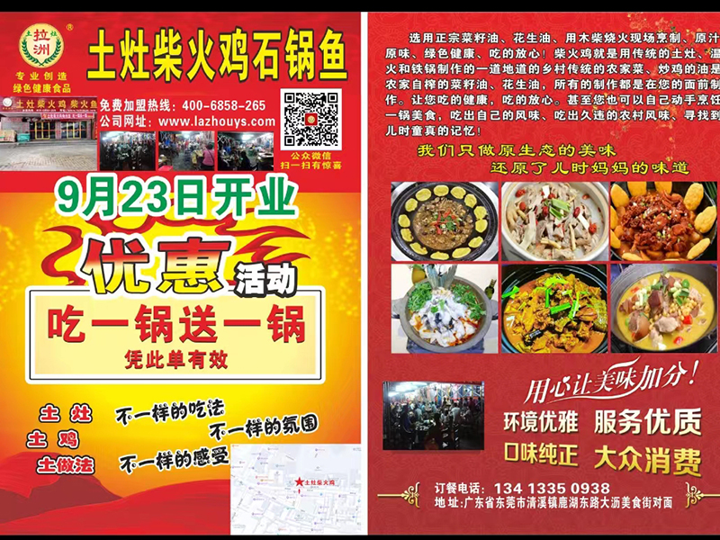 店面介绍:东莞清溪鹿湖店是一家专业推广特色土灶柴火鸡、柴火鱼、柴火羊肉、柴火狗肉的餐饮连锁机构。本店推出传统乡村土灶柴火鸡,柴火鱼,柴火羊肉,柴火狗肉农村大铁锅等,劈柴生火,独家秘方,口味独特,现场制作,秉承(绿色,营养,健康)的宗旨,菜肴原滋原味,清而不淡,香而不腻,其别具特色就餐模式,温馨舒适的就餐环境,是你商务宴请,亲友欢聚,品农家特色美食的最佳之选!